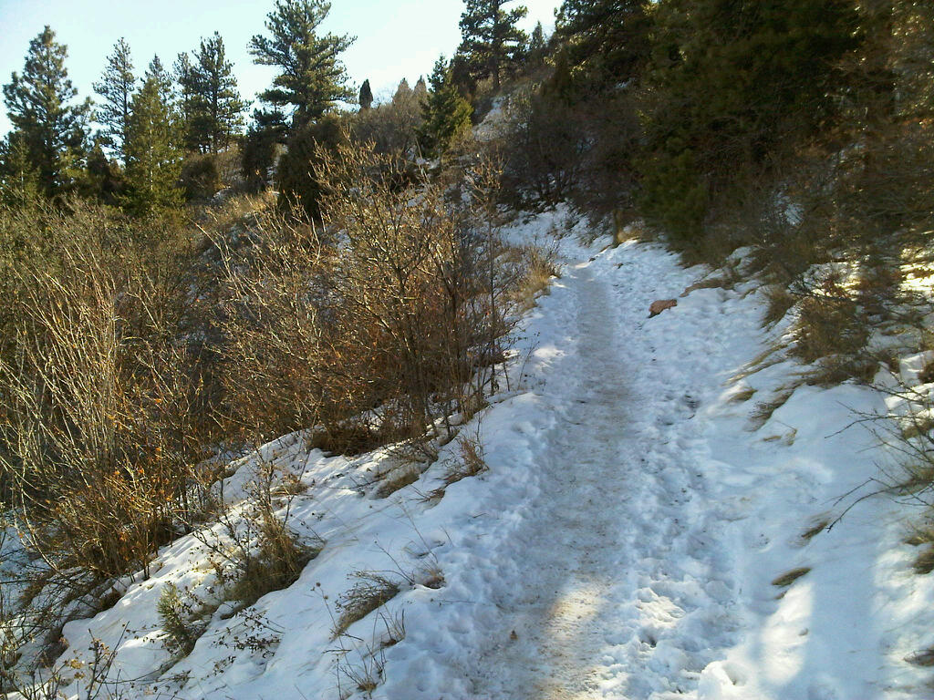 A shaded section of the trail, about two-thirds of the way up. Gentle, smooth pedaling was all that was needed to keep cranking on the snow.