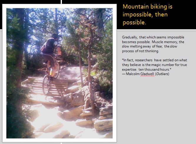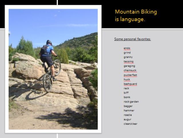My favorite made-up mountain biking words are granny, puckerfest, tacoing, and, of course, garaging (see earlier post).