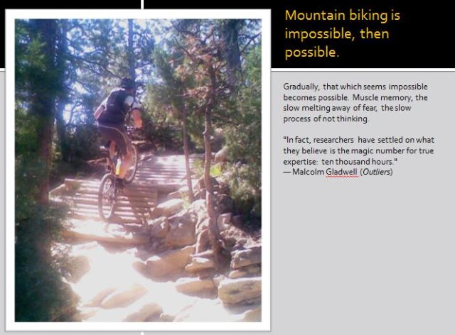 So the talk I’d prepped and obsessed and researched over was: Deconstructed Mountain Biking. Basically taking the idea and sport of mountain biking and attempting to find a true definition of it, and in that process uncovering the true meaninglessness of it. Once you deconstruct something, it ends up being rendered totally empty and devoid of knowledge.