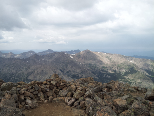 John and I somehow forged our way along a high ridge, and then we scrambled up a boulder field. The only way I could keep going was to keep my eyes focused on the next rock in front of me. (I don’t like heights, or exposure, much.)